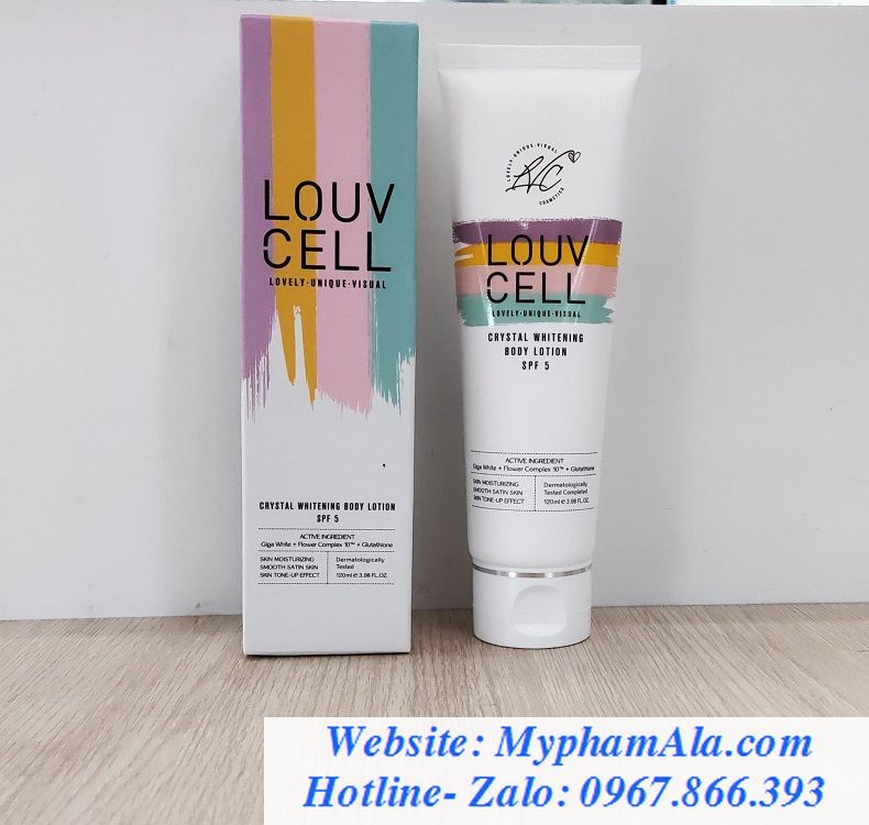 Sữa Dưỡng Thể Trắng Da Louv Cell Crystal Whitening Body Lotion Spf50 với thành phần chính là Vitamin C và Hylaluronic Acid có khả năng giúp làn da trở nên căng mịn, trắng hồng không tỳ vết và dưỡng ẩm cho làn da căng mọng nước. Louv Cell Crystal Whitening Body Lotion có thể sử dụng để thoa lên da ngay sau khi tắm, ngoài khả năng làm trắng da thì Louv Cell Crystal còn giúp cung cấp độ ẩm để nuôi dưỡng tế bào da từ sâu bên trong, ngăn ngừa hiệu quả các dấu hiệu lão hóa do tuổi tác hay tác động của môi trường mang lại.